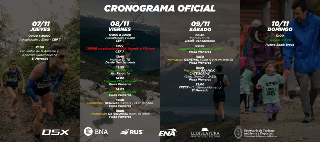 La edición 2024 incluirá las modalidades Classic (15 km) y Short Trail (42 km), y se llevará a cabo del 7 al 10 de noviembre. Además, del 1 al 3 de noviembre en Merlo, San Luis, se desarrollarán otras pruebas como Vertical, Long Trail y U20. Como es habitual, el K15 dará inicio el viernes 8 de noviembre a las 14:00 horas, y el K42 (Short Trail) el sábado 9 a las 8:00 horas. Junto con el Campeonato Sudamericano, el evento también contará con las competencias populares KFuture (6k para U16 y U20), Grand K (15k+42k), Relevos (2x21k) y KKids.