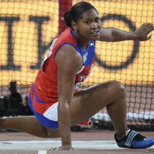 Image copyrightAFPImage captionLa atleta cubana perdió el equilibrio, pero se mantuvo en el círculo de lanzamiento para validar la marca ganadora.