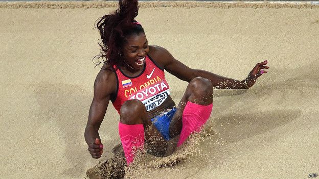 Image copyrightAFPImage captionLa colombiana logró su mejor salto en su cuarto intento al conseguir una marca de 14,90 metros.