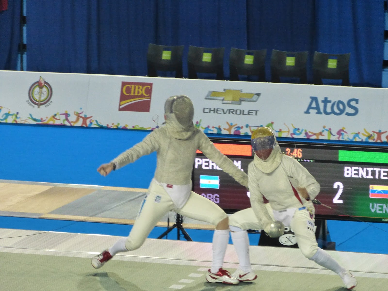 En el mismo predio en el que se encuentra la pileta olímpica y saltos ornamentales, en los que se compitió durante la primera semana de los Juegos Panamericanos, llegó el turno de Esgrima y la primera especialidad que compitió fue «Sable individual» masculino y femenino. Los partidos de esgrima individual terminan cuando se han contado 15 golpes o nueve minutos de tiempo efectivo de combate