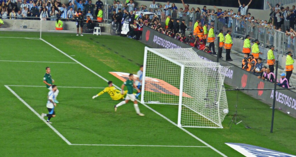Cuando iban 19′ una errónea salida de un defensor de Bolivia en la izquierda por una acción de Lautaro Martínez, pase a Lionel Messi quien entrando al área definió de zurda al primer palo y puso el 1 a 0 parcial.