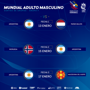 Argentina, que la primera fase la jugará en la ciudad polaca de Cracovia, debutará el 13 de enero a las 18hs (hora local) frente a Países Bajos (10° en el último europeo) que recibió una Wild Card por parte de la IHF tras caer en su eliminatoria ante Portugal.