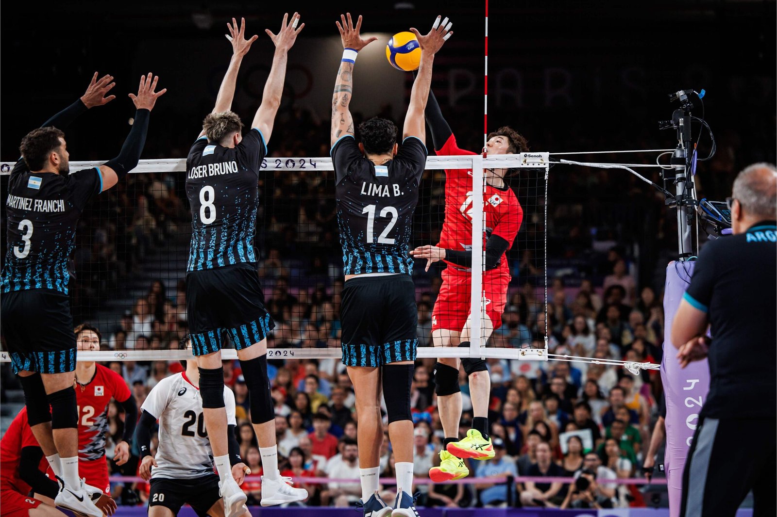 En el inicio del partido hubo paridad hasta que Japón pudo sacar tres de distancia 12-9 tras dos puntos directos de saque. A medida que avanzó el set, los asiáticos crecieron en defensa y contraataque, sobre todo a través de su opuesto que en los puntos largos fue clave para cerrarlos a su favor. En el cierre, Japón volvió a presionar con su servicio y resolvió rápidamente 20-15 y 25-16 en 21 minutos de juego.