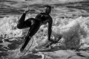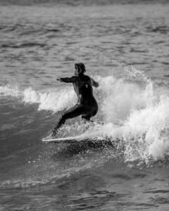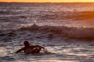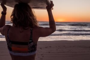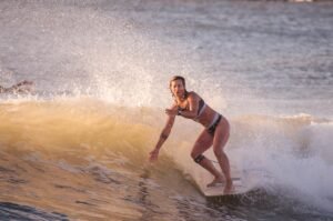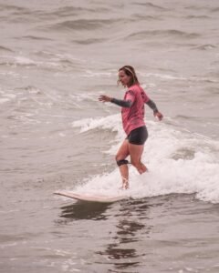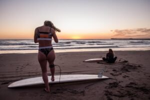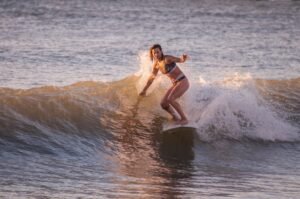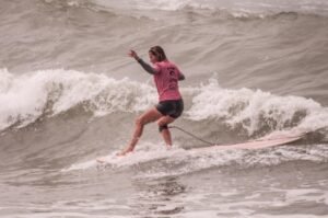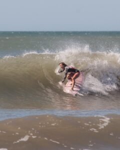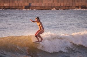 Playas del Sur marplatense, el sol comienza a brillar con fuerza mientras van llegando los primeros habitantes playeros de la jornada. Ahí está con su tabla y equipo Agostina Pellizzari, acompañada por su hermana Ornella, la «múltiple campeonísima nacional».