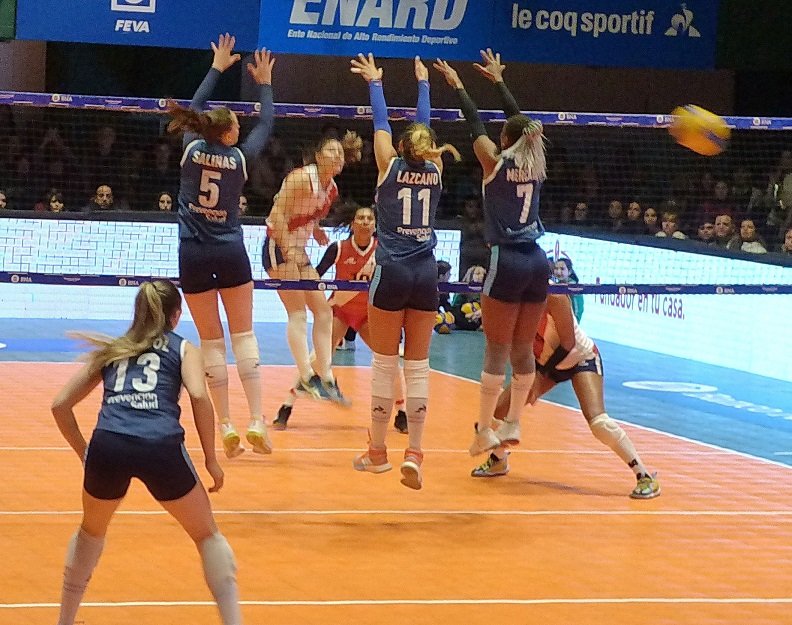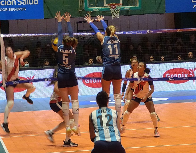 Si bien en el inicio del primer set, las visitantes tomaron ventaja 5-1, rápidamente las albicelestes -luego de un tiempo técnico- lograron equiparar el juego y darlo vuelta ganando en la red con Bianca Farriol y la potencia de Erika Mercado. Ya con ventaja a favor, las locales se quedaron con el primer set 25.21 destacándose Candelaria Salinas como una «muralla» difícil de superar por las rivales.