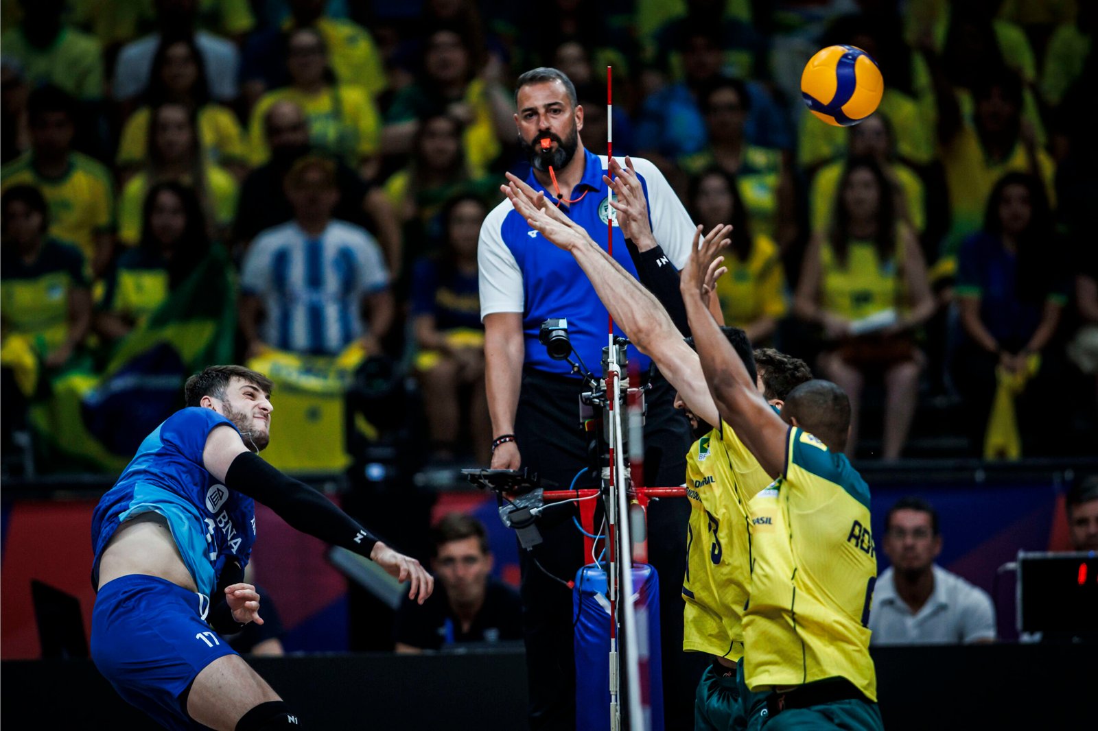 En el Brasil-Argentina pasó de todo: momentos vibrantes a estadio lleno, por supuesto, sets para uno y otro, tarjetas amarillas, discusiones, desacuerdos, festejos un tanto desmedidos, en fin, un verdadero clásico sudamericano. Fue victoria para los locales, que se impusieron 3-2 con parciales de 25-13, 20-25, 19-25, 25-23 y 15-11. El comienzo del partido fue para el olvido por parte del conjunto albiceleste, pero luego mejoraron notablemente y estuvieron 2-1 arriba en sets. En el cuarto ambos bandos no lograban alejarse uno del otro con claridad, pero Brasil fue quien logró quedarse con el chico y forzar un tie-break. Allí La Canarinha se adelantó y remató con un 15-11.
